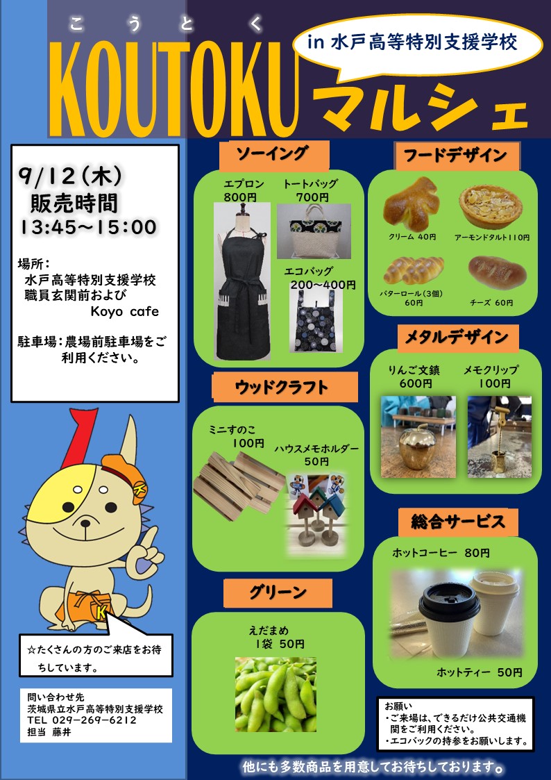 専門教科情報 ・専門教科1年生プレコース(3月17日) マルシェ ・KOUTOKUマルシェin大洗マルシェ(1月23日) ・KOUTOKUマルシェinエクセル南(12月12日) ・KOUTOKUマルシェ(水戸高等特別支援学校開催)(9月12日) ・KOUTOKUマルシェin大洗チラシ(7月2日) ・歴史館マルシェ(6月1日) ・KOUTOKUマルシェin歴史館チラシ ・歴史館まつり(6月1日) アビリンピック ・アビリンピック茨城大会(7月20,21日) ・アビリンピック校内予選会 各コースのページへ ・フードデザインコース ・グリーンサービスコース ・ウッドクラフトコース ・メタルデザインコース ・ソーイングコース ・クリーニングコース ・総合サービスコース ・ビルメンテナンスコース